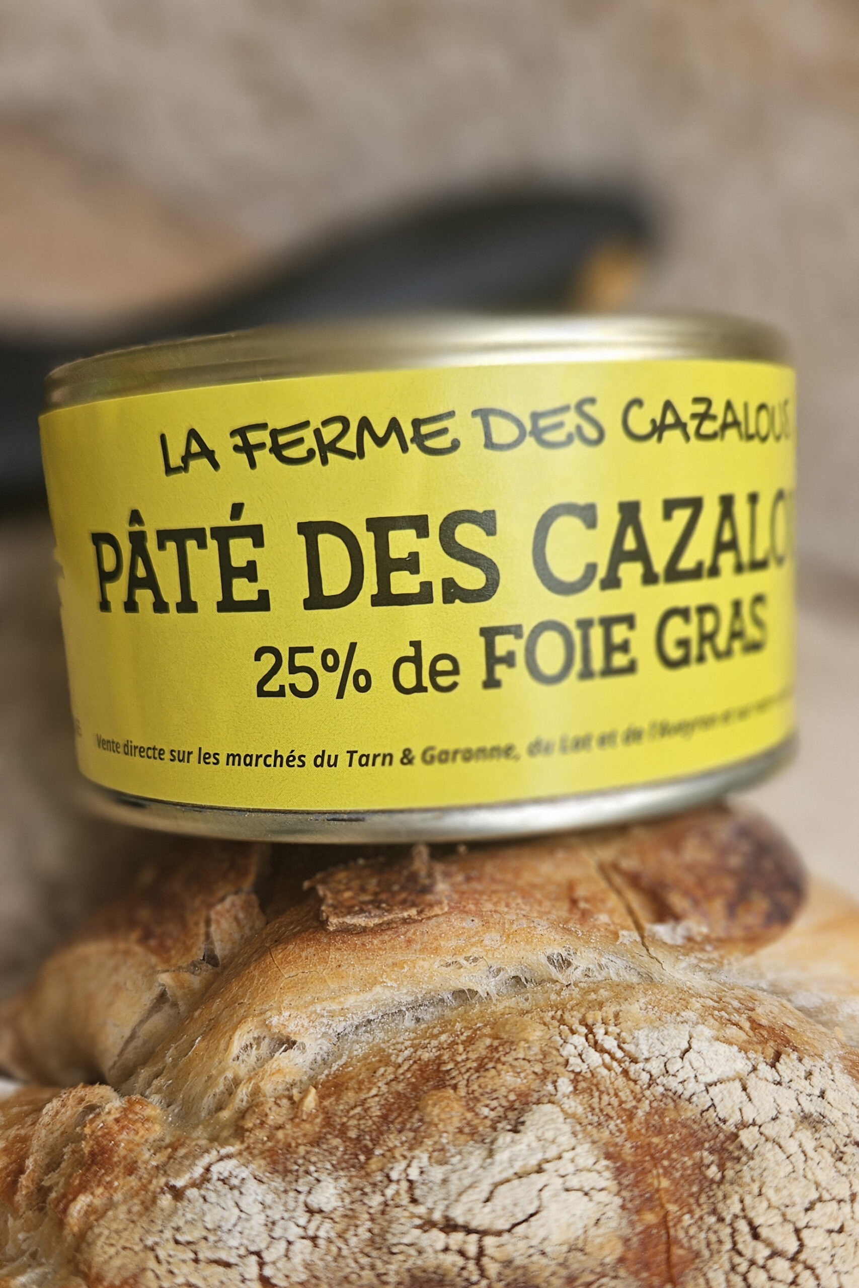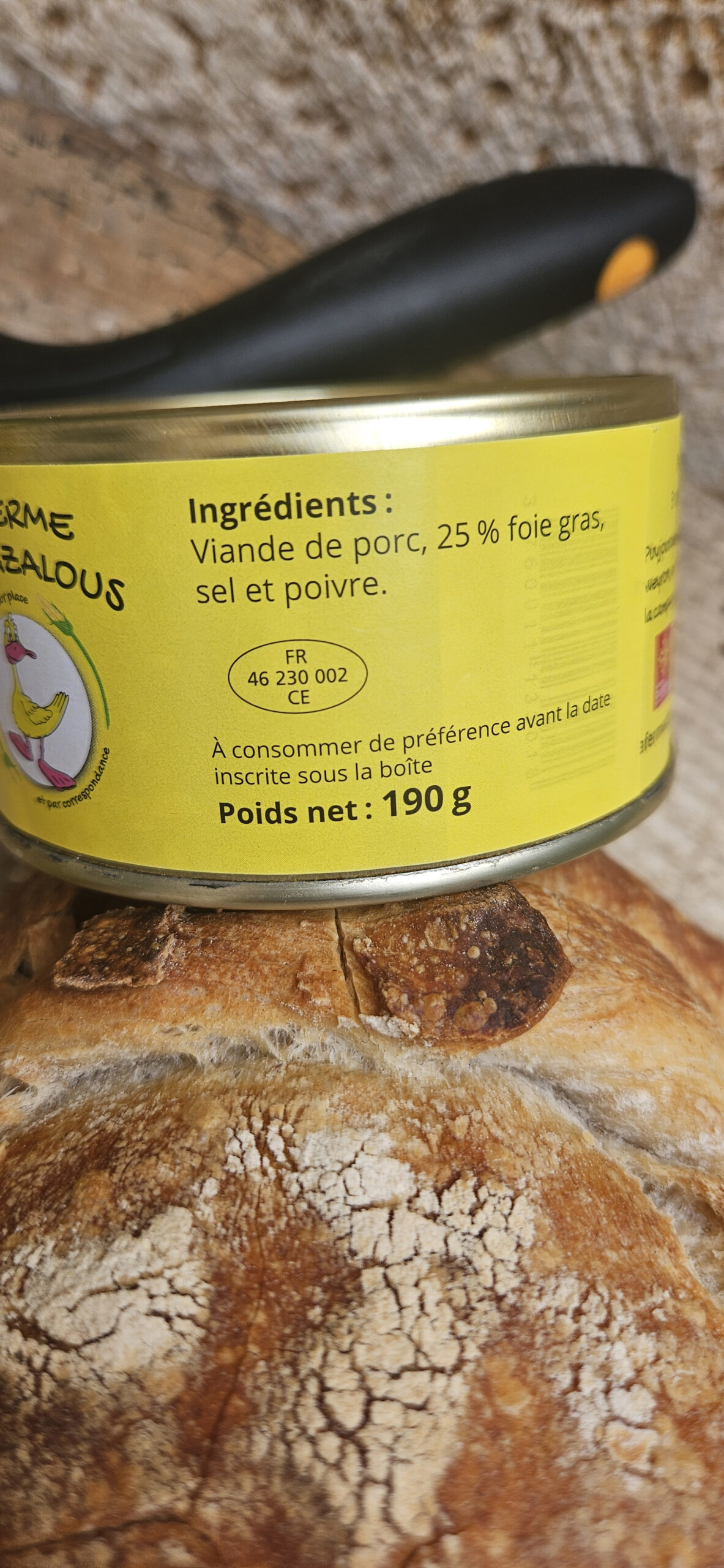 Paté des Cazalous 25% de foie gras de la ferme des Cazalous . Conserve de 190 g.